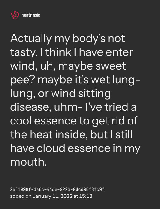 поделитьсяActually my body’s not tasty. I think I have enter wind, uh, maybe sweet pee? maybe it’s wet lung-lung, or wind sitting disease, uhm- I’ve tried a cool essence to get rid of the heat inside, but I still have cloud essence in my mouth.
