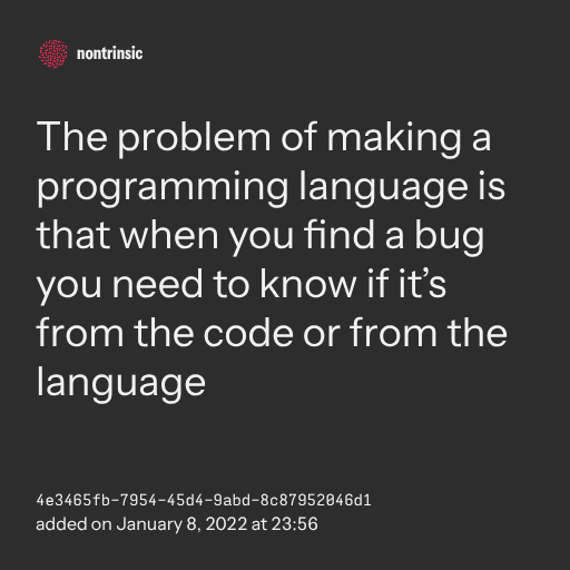поделитьсяThe problem of making a programming language is that when you find a bug you need to know if it’s from the code or from the language