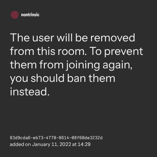 поделитьсяThe user will be removed from this room. To prevent them from joining again, you should ban them instead.