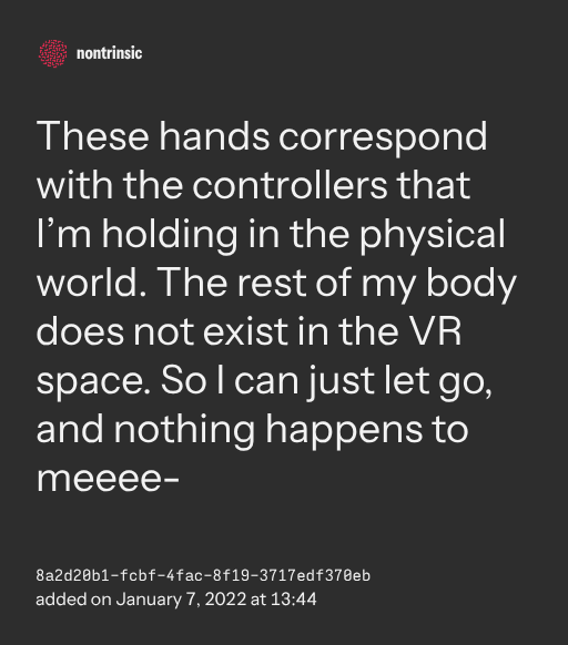 поделитьсяThese hands correspond with the controllers that I’m holding in the physical world. The rest of my body does not exist in the VR space. So I can just let go, and nothing happens to meeee-