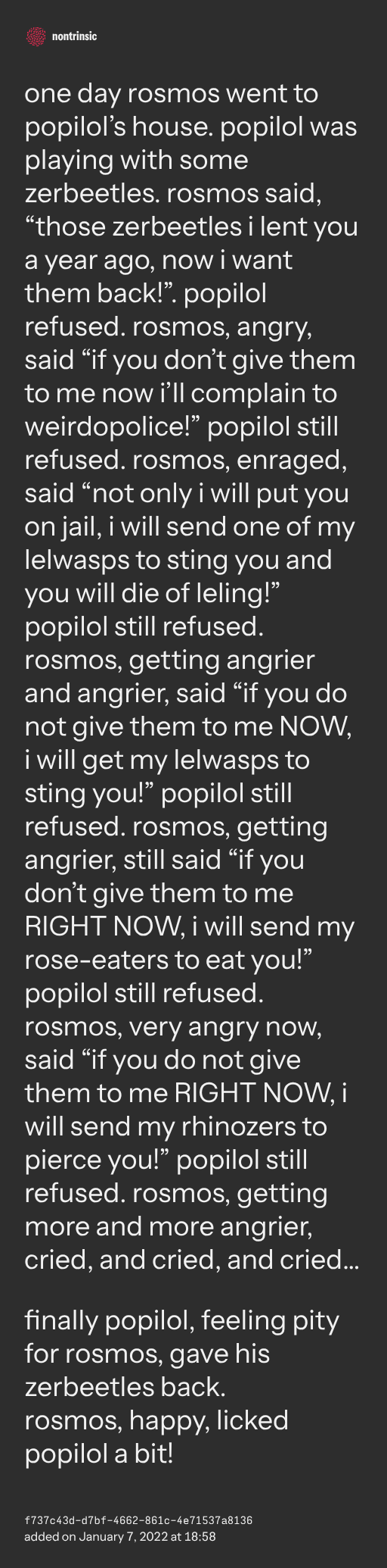 поделитьсяone day rosmos went to popilol’s house. popilol was playing with some zerbeetles. rosmos said, “those zerbeetles i lent you a year ago, now i want them back!”. popilol refused. rosmos, angry, said “if you don’t give them to me now i’ll complain to weirdopolice!” popilol still refused. rosmos, enraged, said “not only i will put you on jail, i will send one of my lelwasps to sting you and you will die of leling!” popilol still refused. rosmos, getting angrier and angrier, said “if you do not give them to me NOW, i will get my lelwasps to sting you!” popilol still refused. rosmos, getting angrier, still said “if you don’t give them to me RIGHT NOW, i will send my rose-eaters to eat you!” popilol still refused. rosmos, very angry now, said “if you do not give them to me RIGHT NOW, i will send my rhinozers to pierce you!” popilol still refused. rosmos, getting more and more angrier, cried, and cried, and cried…
