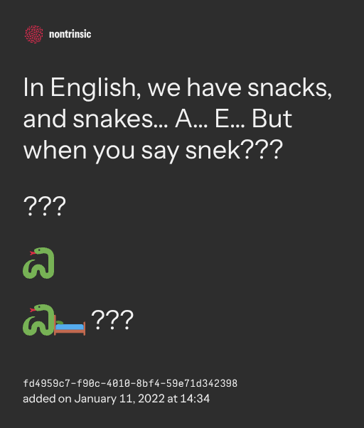 поделитьсяIn English, we have snacks, and snakes… A… E… But when you say snek???