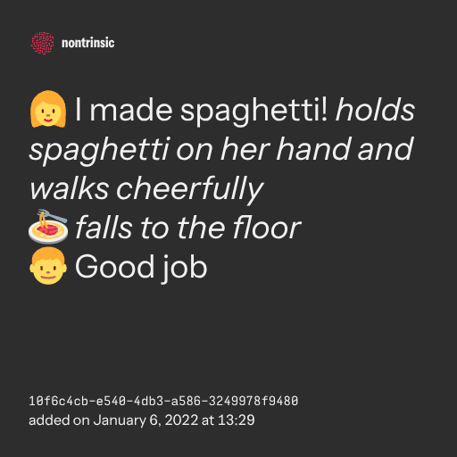 поделиться👩 I made spaghetti! holds spaghetti on her hand and walks cheerfully