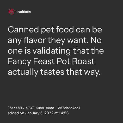 поделитьсяCanned pet food can be any flavor they want. No one is validating that the Fancy Feast Pot Roast actually tastes that way.