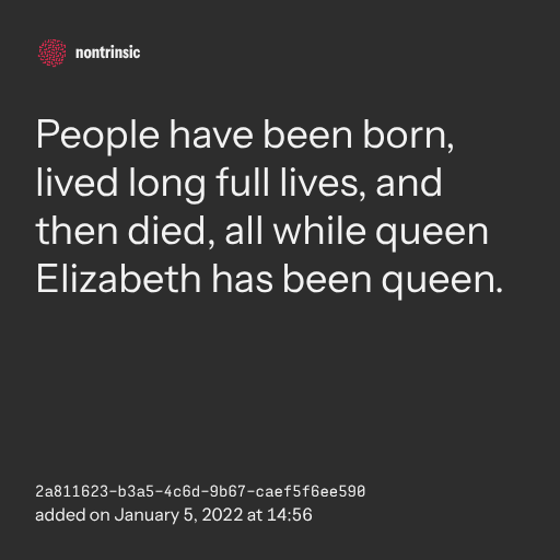 поделитьсяPeople have been born, lived long full lives, and then died, all while queen Elizabeth has been queen.