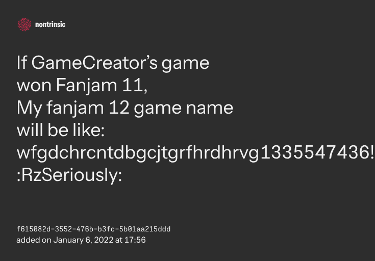 My fanjam 12 game name will be like: wfgdchrcntdbgcjtgrfhrdhrvg1335547436! :RzSeriously:
