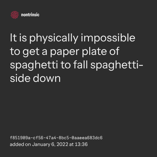 поделитьсяIt is physically impossible to get a paper plate of spaghetti to fall spaghetti-side down