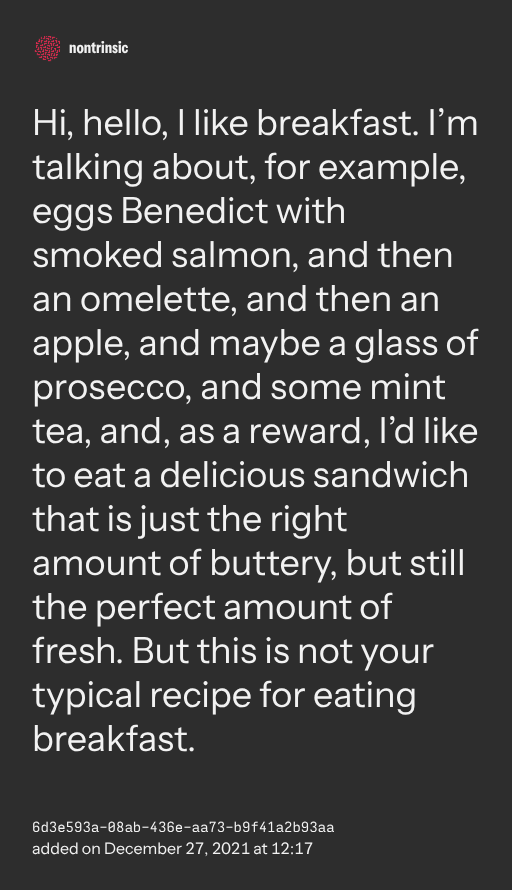 поделитьсяHi, hello, I like breakfast. I’m talking about, for example, eggs Benedict with smoked salmon, and then an omelette, and then an apple, and maybe a glass of prosecco, and some mint tea, and, as a reward, I’d like to eat a delicious sandwich that is just the right amount of buttery, but still the perfect amount of fresh. But this is not your typical recipe for eating breakfast.