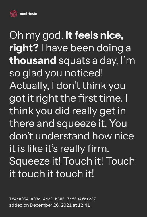 поделитьсяOh my god. It feels nice, right? I have been doing a thousand squats a day, I’m so glad you noticed! Actually, I don’t think you got it right the first time. I think you did really get in there and squeeze it. You don’t understand how nice it is like it’s really firm. Squeeze it! Touch it! Touch it touch it touch it!