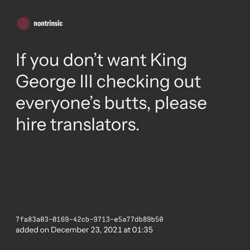 поделитьсяIf you don’t want King George III checking out everyone’s butts, please hire translators.