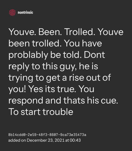 поделитьсяYouve. Been. Trolled. Youve been trolled. You have problably be told. Dont reply to this guy, he is trying to get a rise out of you! Yes its true. You respond and thats his cue. To start trouble