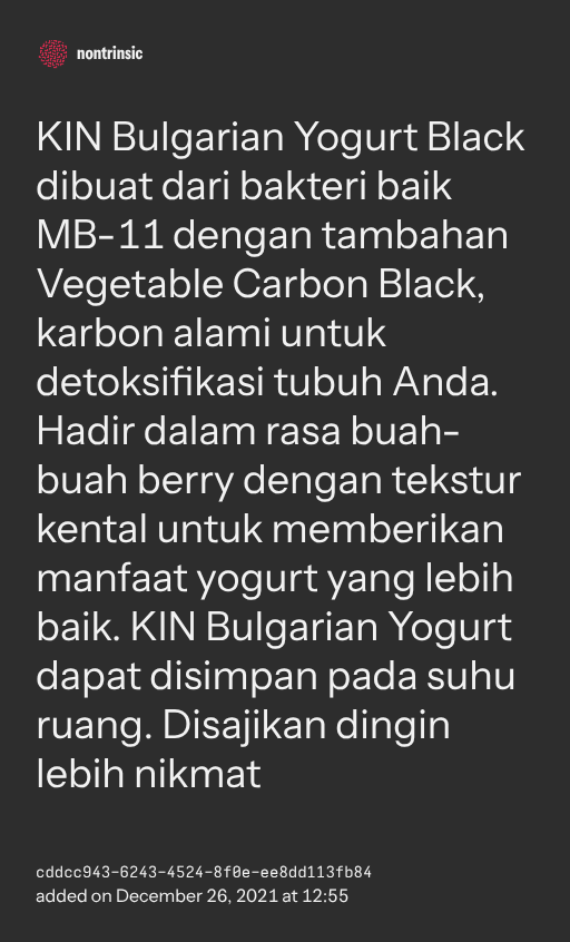 поделитьсяKIN Bulgarian Yogurt Black dibuat dari bakteri baik MB-11 dengan tambahan Vegetable Carbon Black, karbon alami untuk detoksifikasi tubuh Anda. Hadir dalam rasa buah-buah berry dengan tekstur kental untuk memberikan manfaat yogurt yang lebih baik. KIN Bulgarian Yogurt dapat disimpan pada suhu ruang. Disajikan dingin lebih nikmat