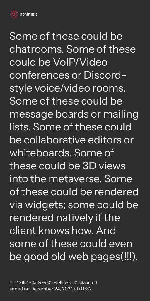 поделитьсяSome of these could be chatrooms. Some of these could be VoIP/Video conferences or Discord-style voice/video rooms. Some of these could be message boards or mailing lists. Some of these could be collaborative editors or whiteboards. Some of these could be 3D views into the metaverse. Some of these could be rendered via widgets; some could be rendered natively if the client knows how. And some of these could even be good old web pages(!!!).