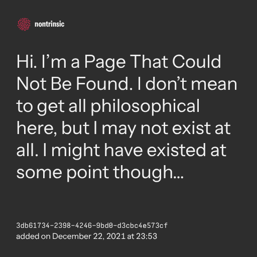 поделитьсяHi. I’m a Page That Could Not Be Found. I don’t mean to get all philosophical here, but I may not exist at all. I might have existed at some point though…