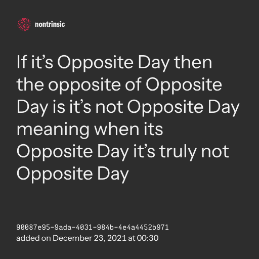 If it’s Opposite Day then the opposite of Opposite Day is it’s not Opposite Day meaning when its Opposite Day it’s truly not Opposite Day