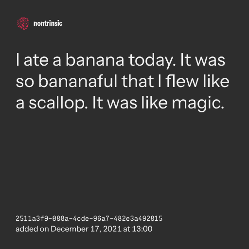 поделитьсяI ate a banana today. It was so bananaful that I flew like a scallop. It was like magic.