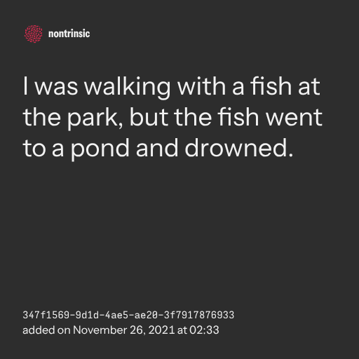 поделитьсяI was walking with a fish at the park, but the fish went to a pond and drowned.