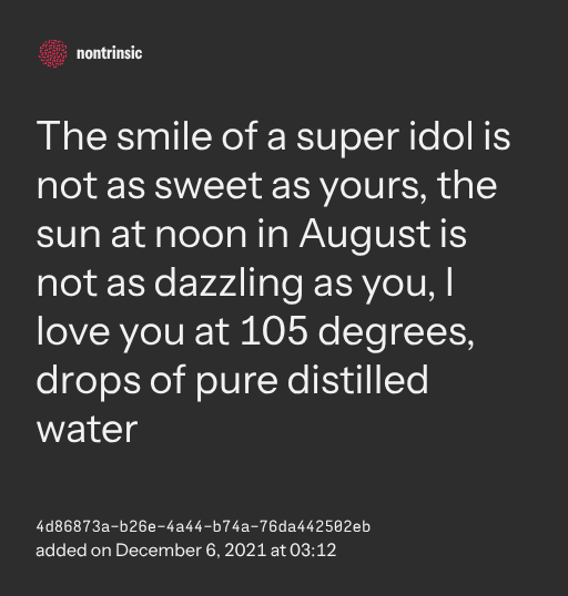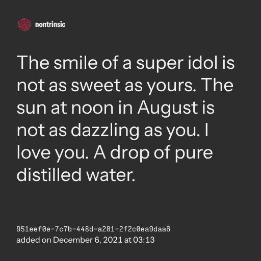 поделитьсяThe smile of a super idol is not as sweet as yours. The sun at noon in August is not as dazzling as you. I love you. A drop of pure distilled water.