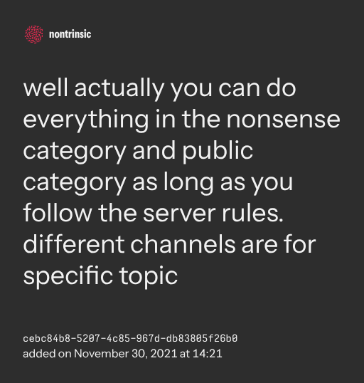 поделитьсяwell actually you can do everything in the nonsense category and public category as long as you follow the server rules. different channels are for specific topic