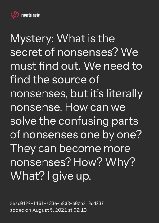 поделитьсяMystery: What is the secret of nonsenses? We must find out. We need to find the source of nonsenses, but it’s literally nonsense. How can we solve the confusing parts of nonsenses one by one? They can become more nonsenses? How? Why? What? I give up.