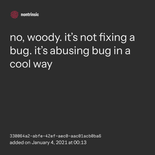 поделитьсяno, woody. it’s not fixing a bug. it’s abusing bug in a cool way