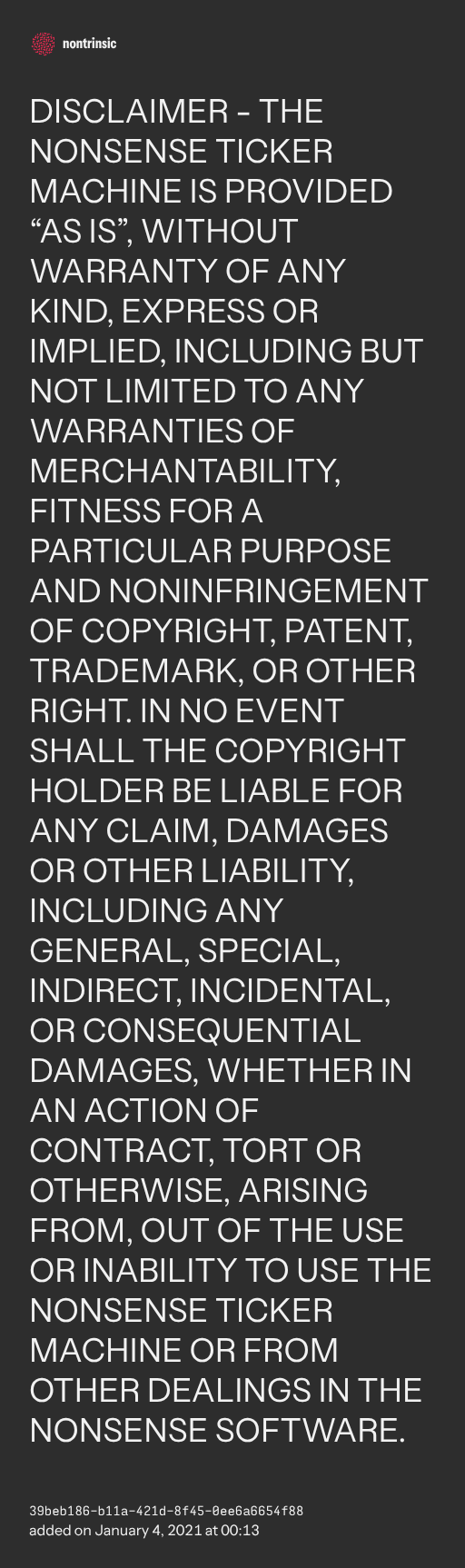 поделитьсяDISCLAIMER - THE NONSENSE TICKER MACHINE IS PROVIDED “AS IS”, WITHOUT WARRANTY OF ANY KIND, EXPRESS OR IMPLIED, INCLUDING BUT NOT LIMITED TO ANY WARRANTIES OF MERCHANTABILITY, FITNESS FOR A PARTICULAR PURPOSE AND NONINFRINGEMENT OF COPYRIGHT, PATENT, TRADEMARK, OR OTHER RIGHT. IN NO EVENT SHALL THE COPYRIGHT HOLDER BE LIABLE FOR ANY CLAIM, DAMAGES OR OTHER LIABILITY, INCLUDING ANY GENERAL, SPECIAL, INDIRECT, INCIDENTAL, OR CONSEQUENTIAL DAMAGES, WHETHER IN AN ACTION OF CONTRACT, TORT OR OTHERWISE, ARISING FROM, OUT OF THE USE OR INABILITY TO USE THE NONSENSE TICKER MACHINE OR FROM OTHER DEALINGS IN THE NONSENSE SOFTWARE.