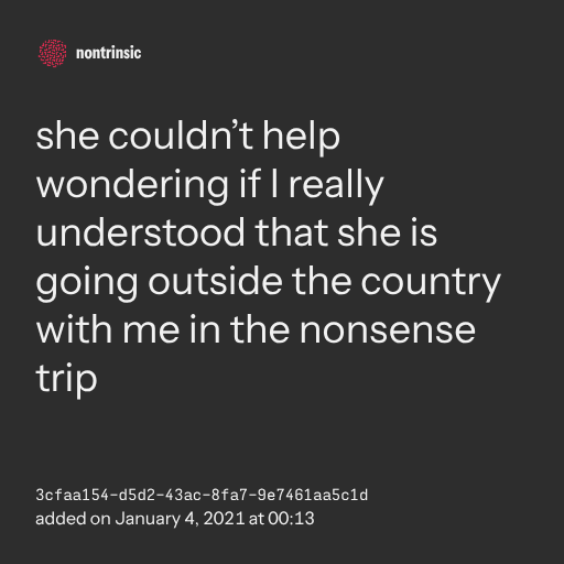 поделитьсяshe couldn’t help wondering if I really understood that she is going outside the country with me in the nonsense trip