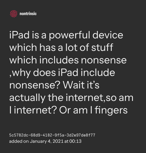 поделитьсяiPad is a powerful device which has a lot of stuff which includes nonsense ,why does iPad include nonsense? Wait it’s actually the internet,so am I internet? Or am I fingers