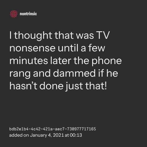 поделитьсяI thought that was TV nonsense until a few minutes later the phone rang and dammed if he hasn’t done just that!