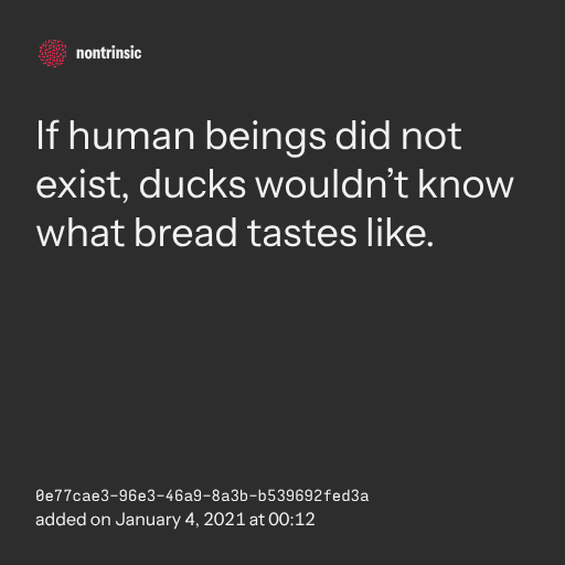 поделитьсяIf human beings did not exist, ducks wouldn’t know what bread tastes like.