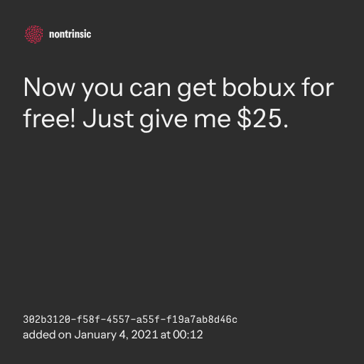 поделитьсяNow you can get bobux for free! Just give me $25.