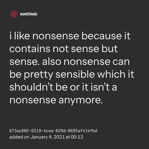 поделитьсяi like nonsense because it contains not sense but sense. also nonsense can be pretty sensible which it shouldn’t be or it isn’t a nonsense anymore.