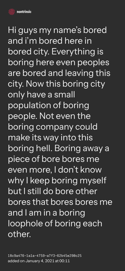 поделитьсяHi guys my name’s bored and i’m bored here in bored city. Everything is boring here even peoples are bored and leaving this city. Now this boring city only have a small population of boring people. Not even the boring company could make its way into this boring hell. Boring away a piece of bore bores me even more, I don’t know why I keep boring myself but I still do bore other bores that bores bores me and I am in a boring loophole of boring each other.