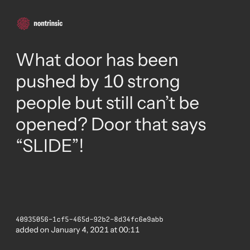 поделитьсяWhat door has been pushed by 10 strong people but still can’t be opened? Door that says “SLIDE”!