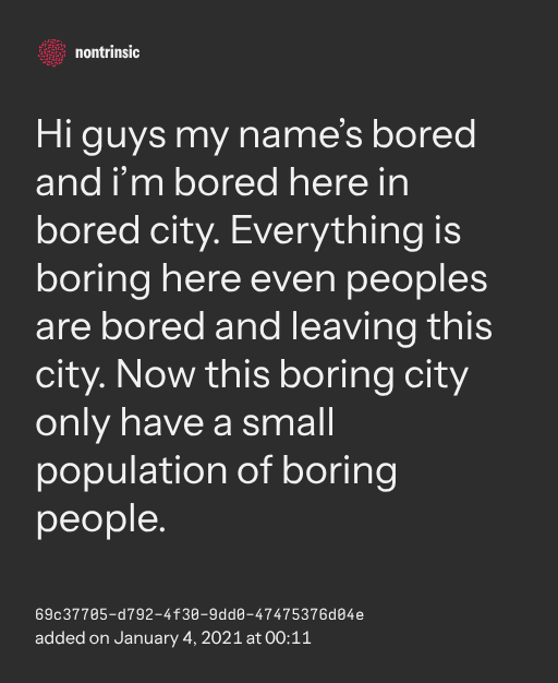 поделитьсяHi guys my name’s bored and i’m bored here in bored city. Everything is boring here even peoples are bored and leaving this city. Now this boring city only have a small population of boring people.