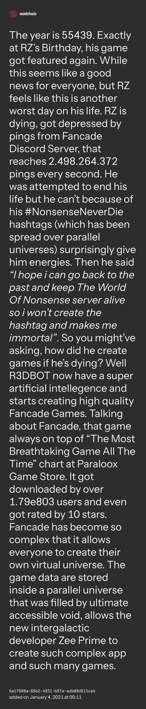 поделитьсяThe year is 55439. Exactly at RZ’s Birthday, his game got featured again. While this seems like a good news for everyone, but RZ feels like this is another worst day on his life. RZ is dying, got depressed by pings from Fancade Discord Server, that reaches 2.498.264.372 pings every second. He was attempted to end his life but he can’t because of his #NonsenseNeverDie hashtags (which has been spread over parallel universes) surprisingly give him energies. Then he said “I hope i can go back to the past and keep The World Of Nonsense server alive so i won’t create the hashtag and makes me immortal”. So you might’ve asking, how did he create games if he’s dying? Well R3DBOT now have a super artificial intellegence and starts creating high quality Fancade Games. Talking about Fancade, that game always on top of “The Most Breathtaking Game All The Time” chart at Paraloox Game Store. It got downloaded by over 1.79e803 users and even got rated by 10 stars. Fancade has become so complex that it allows everyone to create their own virtual universe. The game data are stored inside a parallel universe that was filled by ultimate accessible void, allows the new intergalactic developer Zee Prime to create such complex app and such many games.