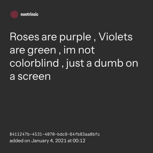 поделитьсяRoses are purple , Violets are green , im not colorblind , just a dumb on a screen