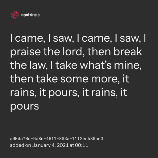 поделитьсяI came, I saw, I came, I saw, I praise the lord, then break the law, I take what’s mine, then take some more, it rains, it pours, it rains, it pours