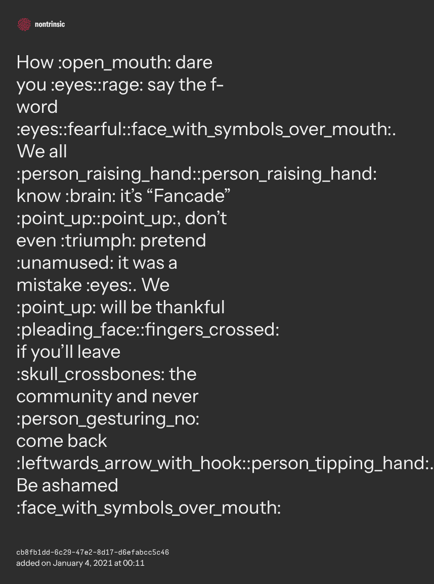 поделитьсяHow :open_mouth: dare you :eyes::rage: say the f-word :eyes::fearful::face_with_symbols_over_mouth:. We all :person_raising_hand::person_raising_hand: know :brain: it’s “Fancade” :point_up::point_up:, don’t even :triumph: pretend :unamused: it was a mistake :eyes:. We :point_up: will be thankful :pleading_face::fingers_crossed: if you’ll leave :skull_crossbones: the community and never :person_gesturing_no: come back :leftwards_arrow_with_hook::person_tipping_hand:. Be ashamed :face_with_symbols_over_mouth: