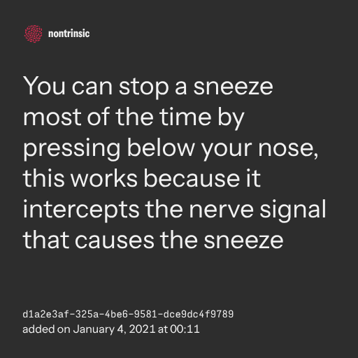 поделитьсяYou can stop a sneeze most of the time by pressing below your nose, this works because it intercepts the nerve signal that causes the sneeze