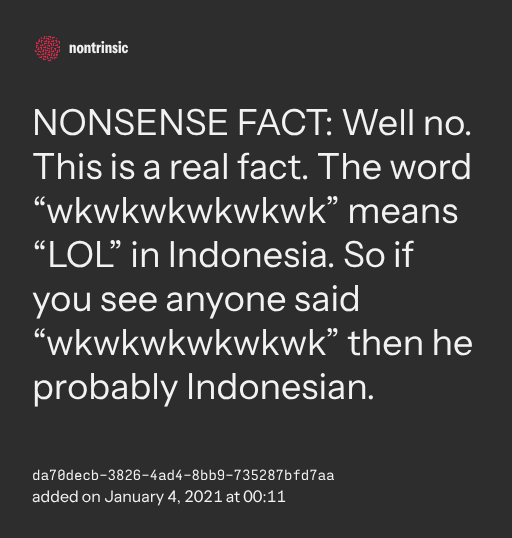 поделитьсяNONSENSE FACT: Well no. This is a real fact. The word “wkwkwkwkwkwk” means “LOL” in Indonesia. So if you see anyone said “wkwkwkwkwkwk” then he probably Indonesian.