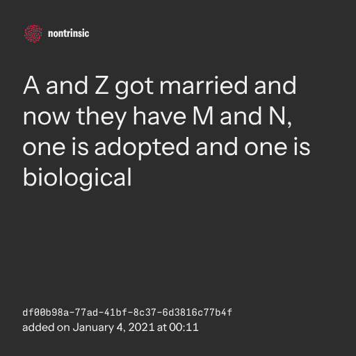 поделитьсяA and Z got married and now they have M and N, one is adopted and one is biological
