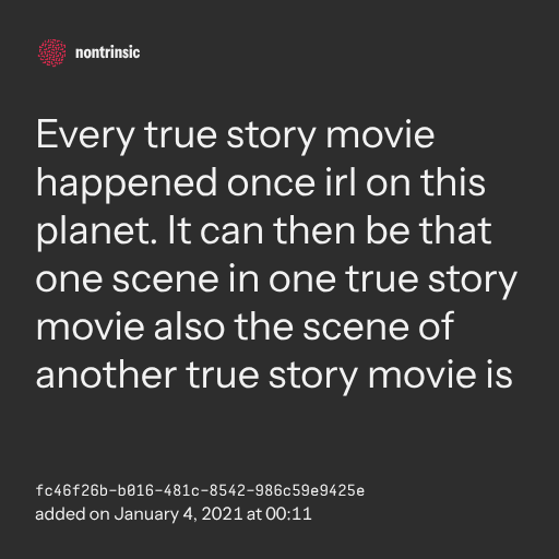 поделитьсяEvery true story movie happened once irl on this planet. It can then be that one scene in one true story movie also the scene of another true story movie is