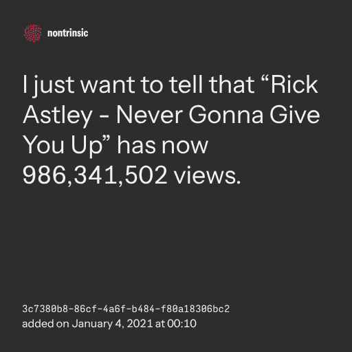 поделитьсяI just want to tell that “Rick Astley - Never Gonna Give You Up” has now 986,341,502 views.