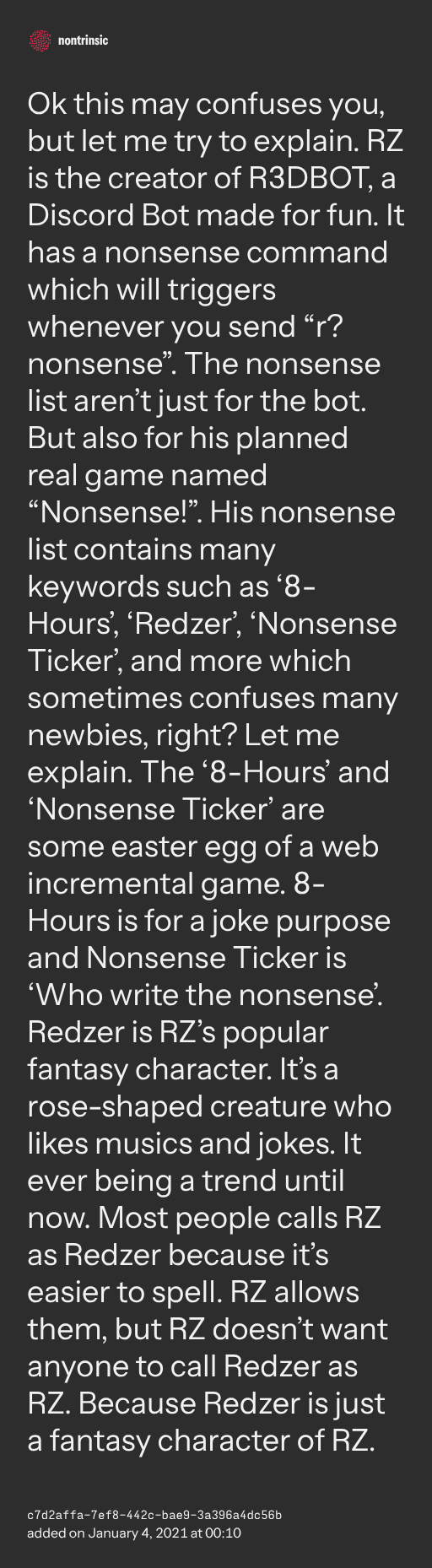 поделитьсяOk this may confuses you, but let me try to explain. RZ is the creator of R3DBOT, a Discord Bot made for fun. It has a nonsense command which will triggers whenever you send “r?nonsense”. The nonsense list aren’t just for the bot. But also for his planned real game named “Nonsense!”. His nonsense list contains many keywords such as ‘8-Hours’, ‘Redzer’, ‘Nonsense Ticker’, and more which sometimes confuses many newbies, right? Let me explain. The ‘8-Hours’ and ‘Nonsense Ticker’ are some easter egg of a web incremental game. 8-Hours is for a joke purpose and Nonsense Ticker is ‘Who write the nonsense’. Redzer is RZ’s popular fantasy character. It’s a rose-shaped creature who likes musics and jokes. It ever being a trend until now. Most people calls RZ as Redzer because it’s easier to spell. RZ allows them, but RZ doesn’t want anyone to call Redzer as RZ. Because Redzer is just a fantasy character of RZ.