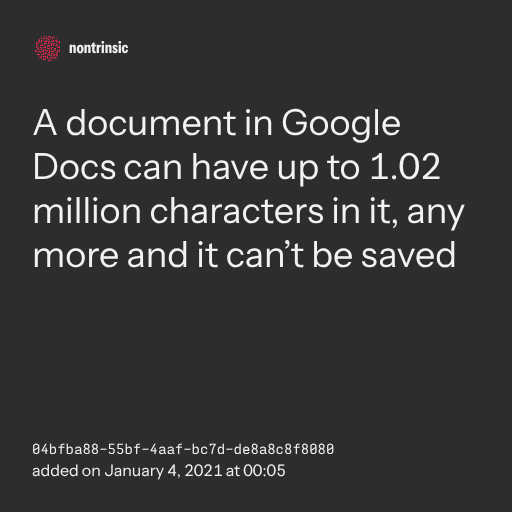 поделитьсяA document in Google Docs can have up to 1.02 million characters in it, any more and it can’t be saved