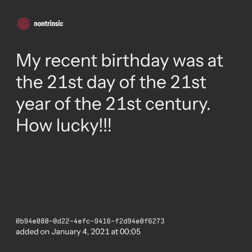 поделитьсяMy recent birthday was at the 21st day of the 21st year of the 21st century. How lucky!!!