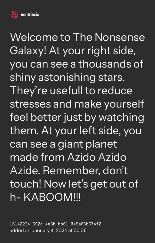 поделитьсяWelcome to The Nonsense Galaxy! At your right side, you can see a thousands of shiny astonishing stars. They’re usefull to reduce stresses and make yourself feel better just by watching them. At your left side, you can see a giant planet made from Azido Azido Azide. Remember, don’t touch! Now let’s get out of h- KABOOM!!!