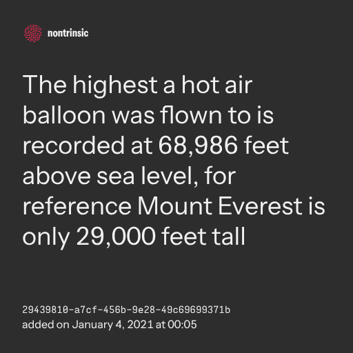 поделитьсяThe highest a hot air balloon was flown to is recorded at 68,986 feet above sea level, for reference Mount Everest is only 29,000 feet tall
