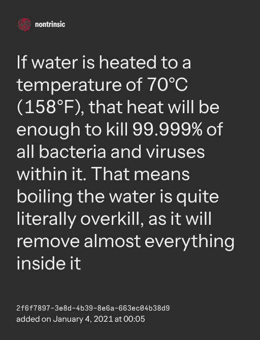поделитьсяIf water is heated to a temperature of 70°C (158°F), that heat will be enough to kill 99.999% of all bacteria and viruses within it. That means boiling the water is quite literally overkill, as it will remove almost everything inside it
